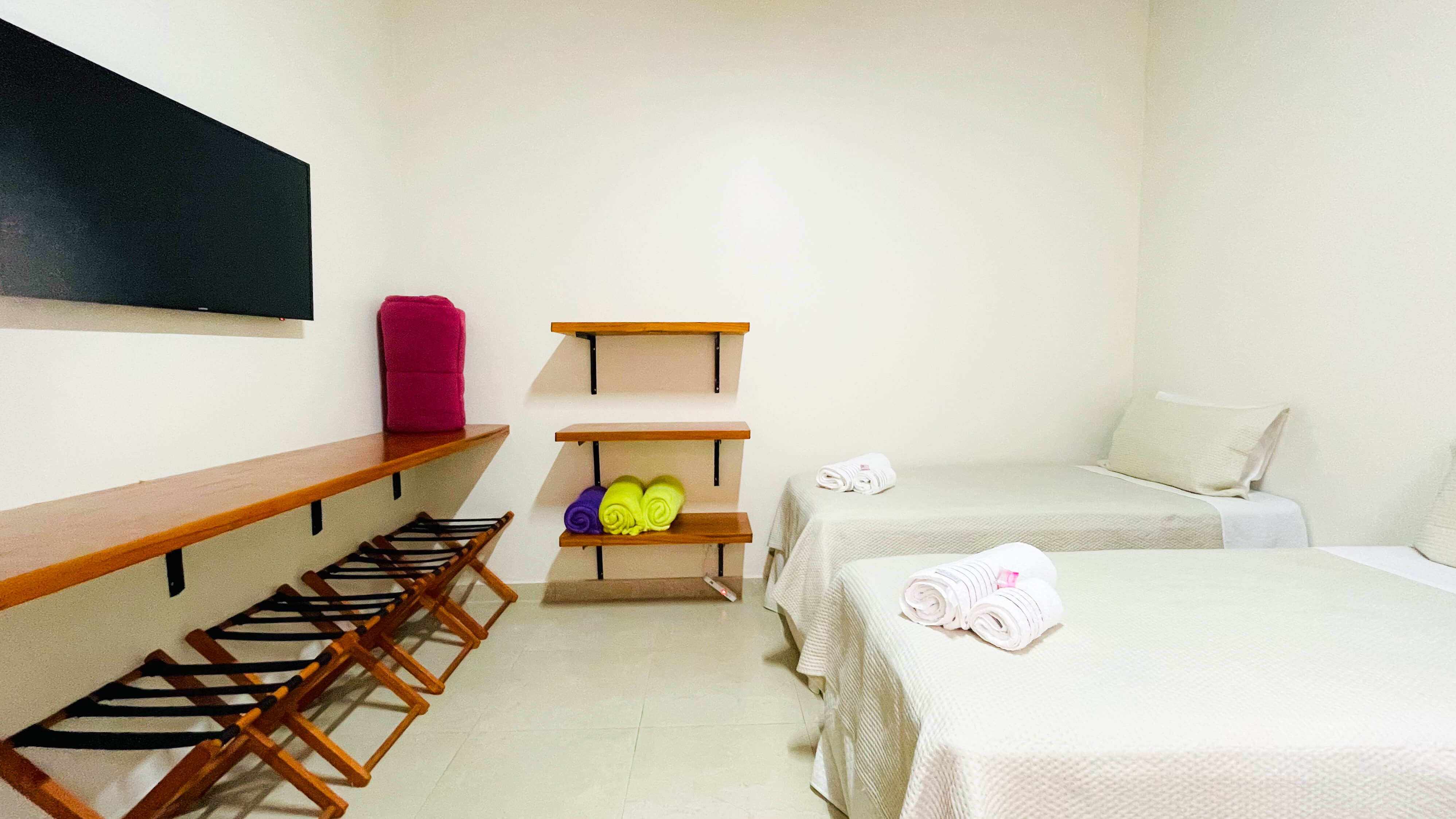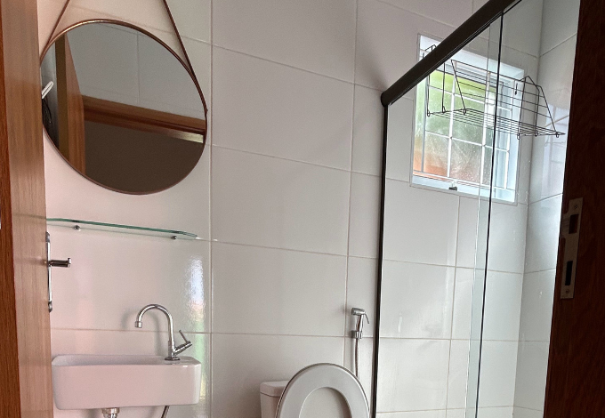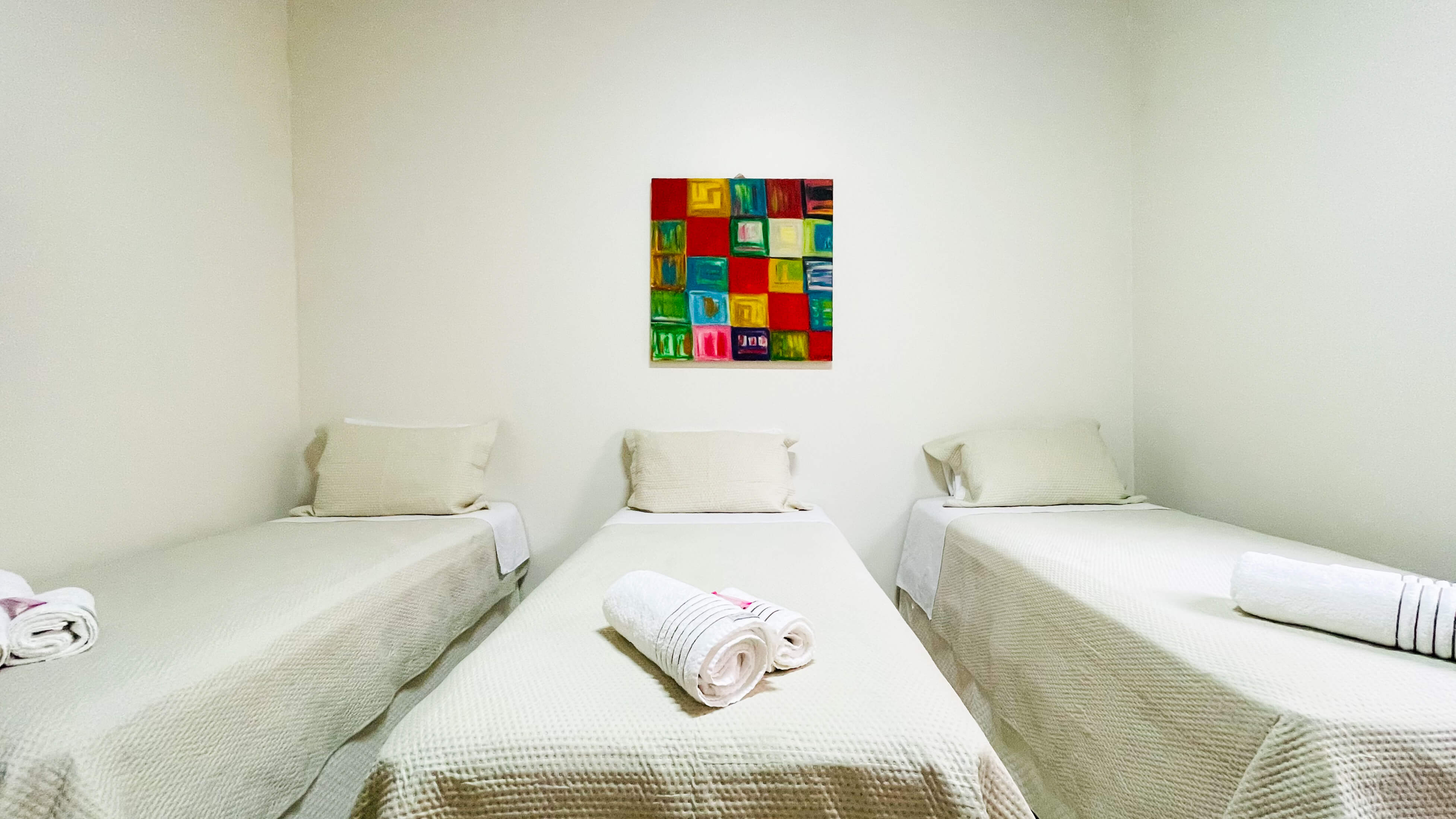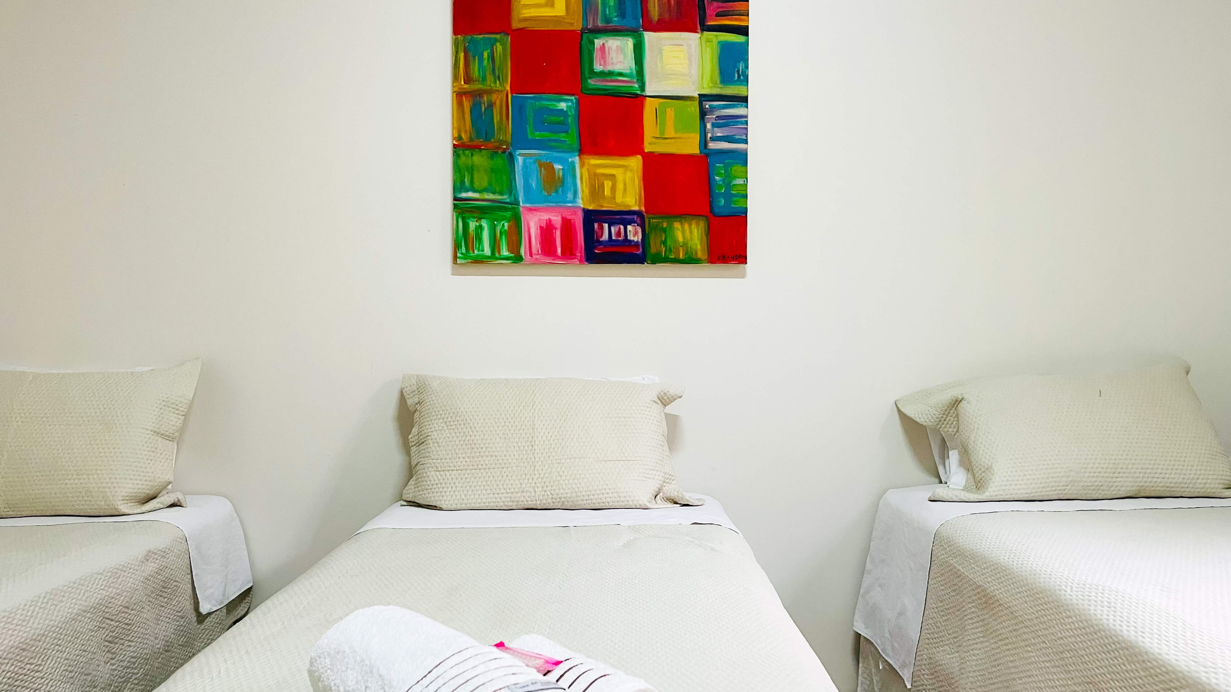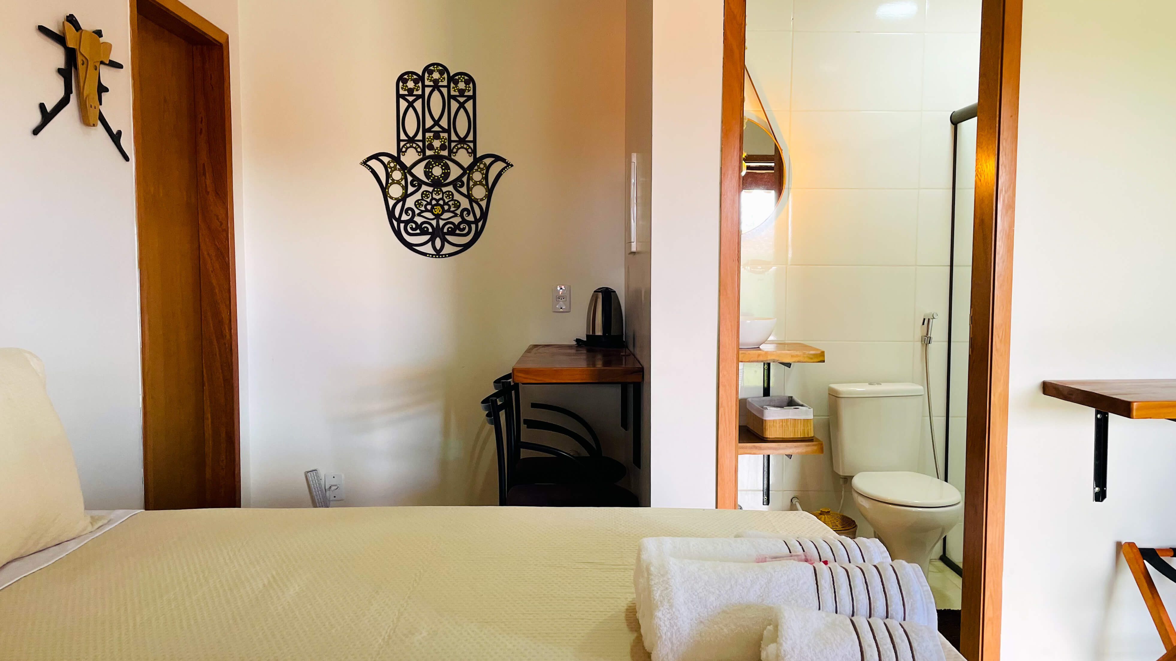Dividida em dois ambientes, essa suíte acolhe famílias ou grupos com muito espaço, luz e afeto. No quarto principal, uma cama de casal. No segundo ambiente, quatro camas de solteiro pensadas para o descanso de todos. A decoração segue a linha rústica da Vila Bonita, sempre com cuidado nos detalhes. Ar-condicionado, frigobar e TV garantem o conforto, enquanto o carinho faz toda diferença.