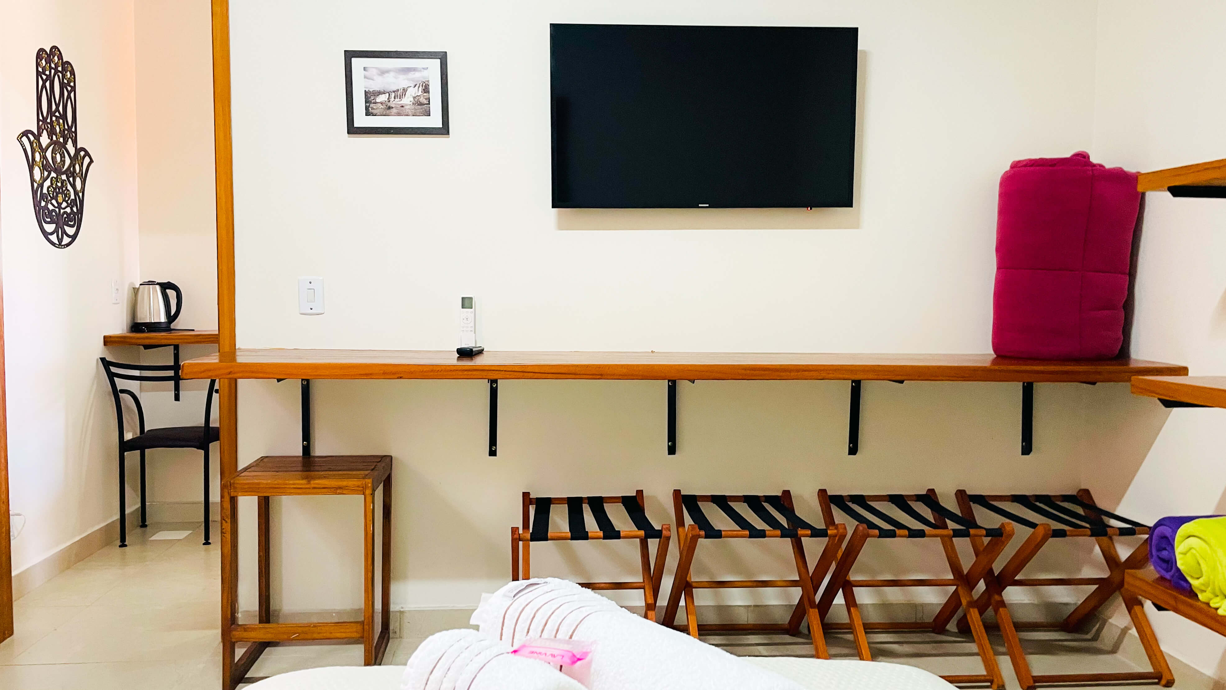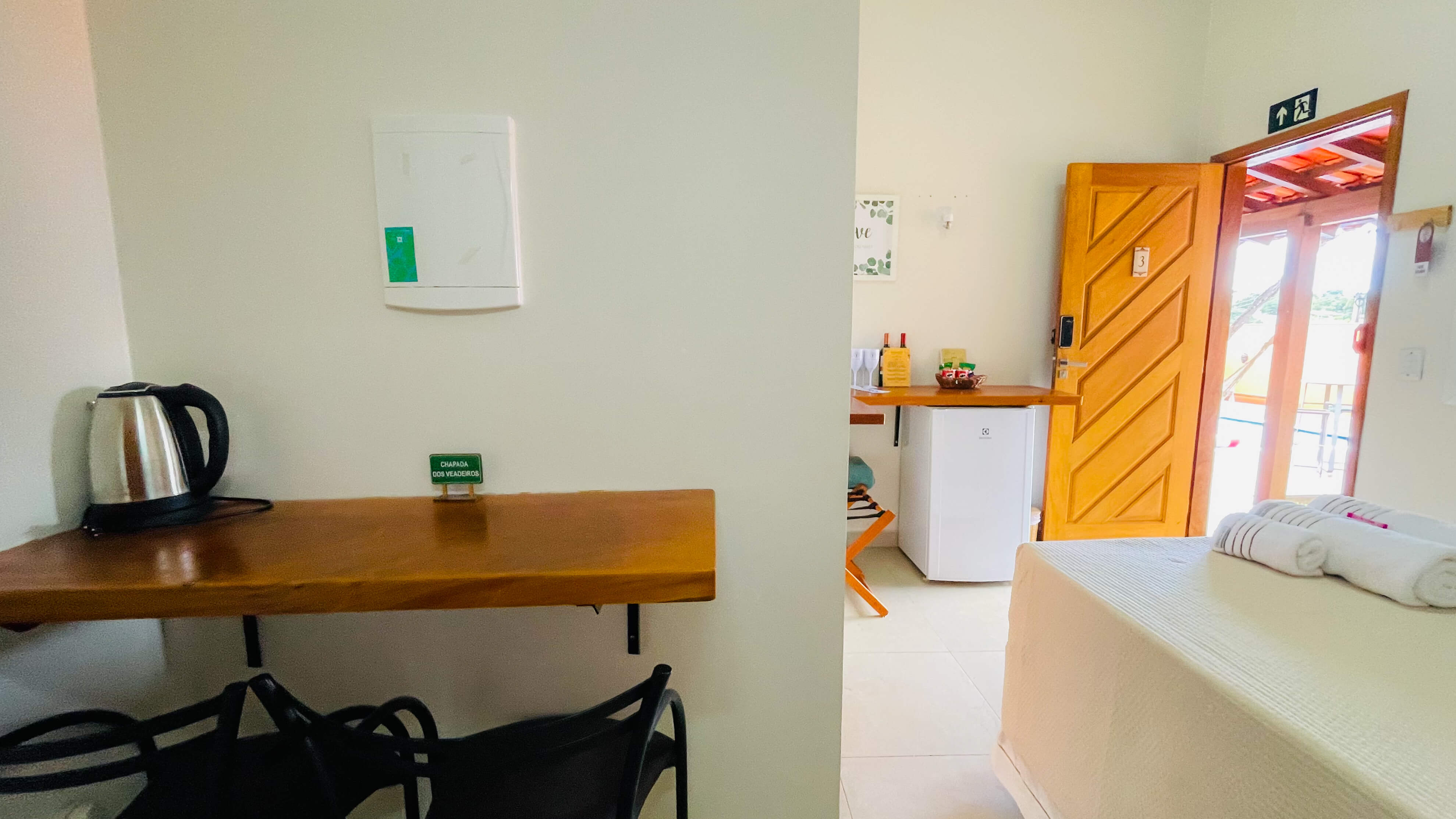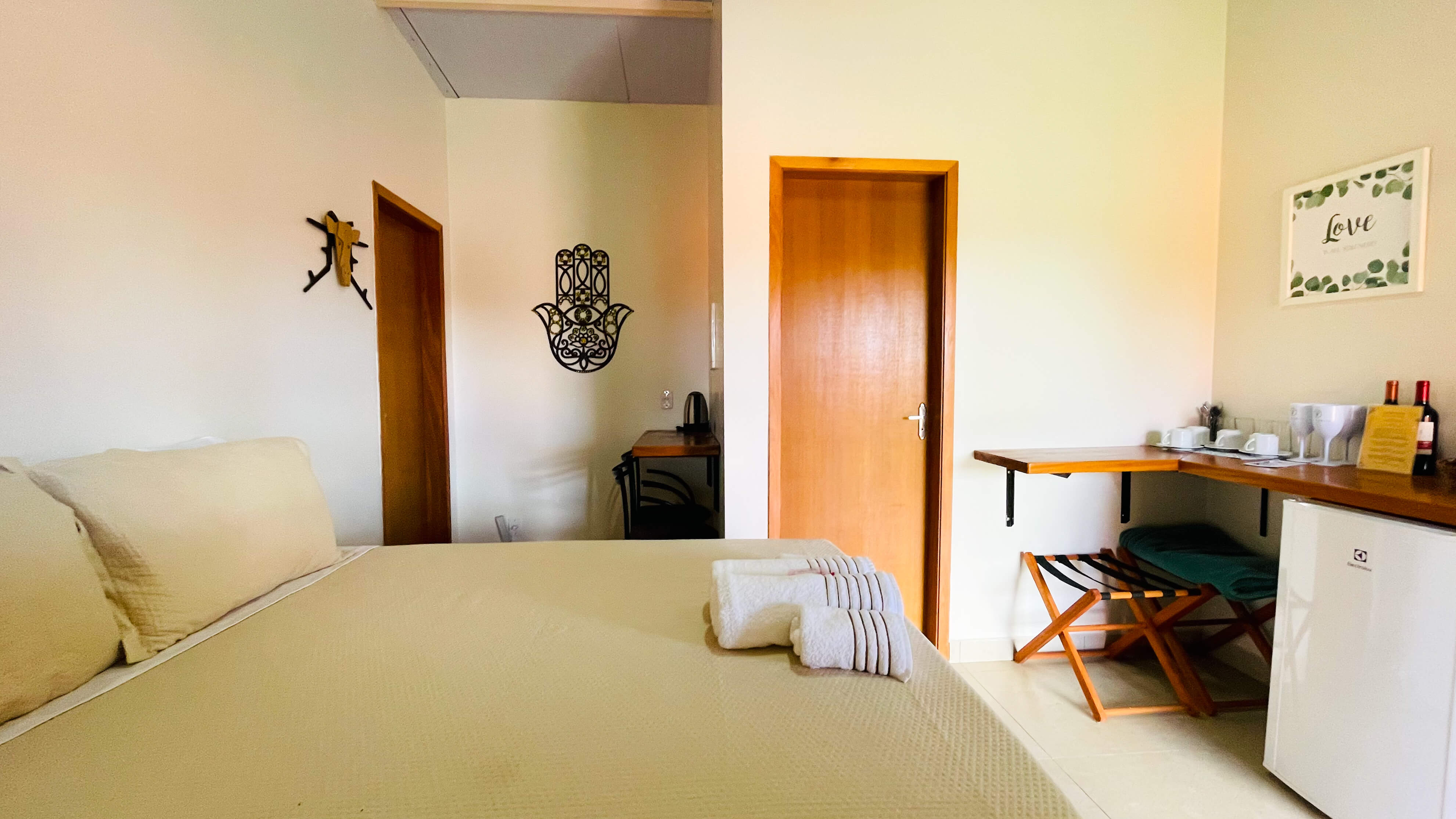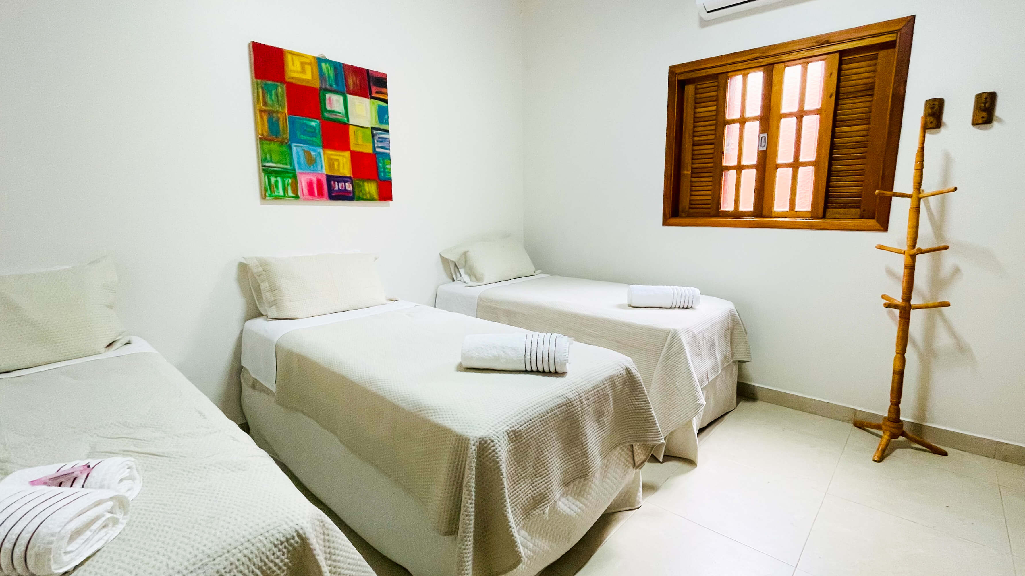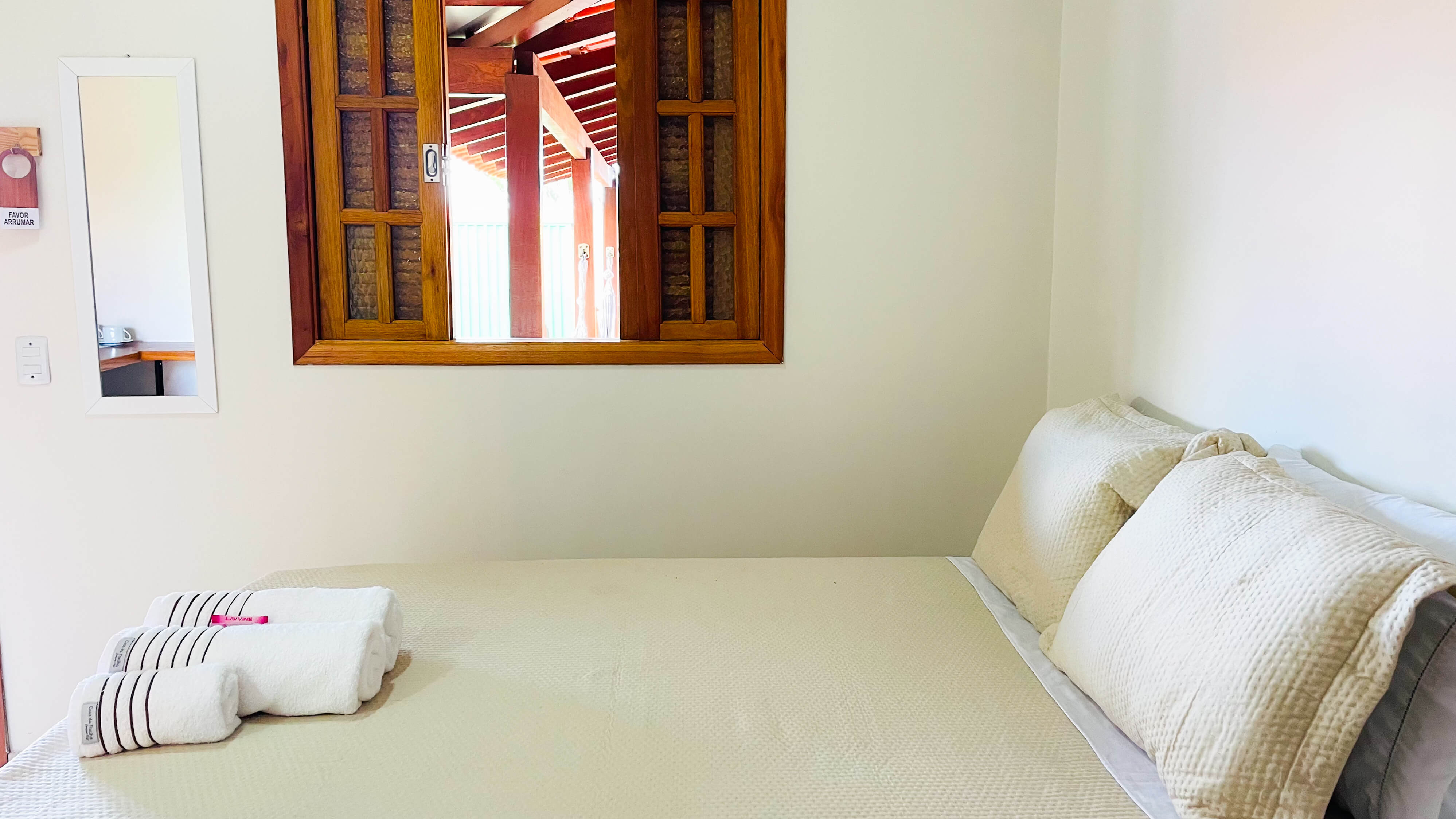 Dividida em dois ambientes, essa suíte acolhe famílias ou grupos com muito espaço, luz e afeto. No quarto principal, uma cama de casal. No segundo ambiente, quatro camas de solteiro pensadas para o descanso de todos. A decoração segue a linha rústica da Vila Bonita, sempre com cuidado nos detalhes. Ar-condicionado, frigobar e TV garantem o conforto, enquanto o carinho faz toda diferença.